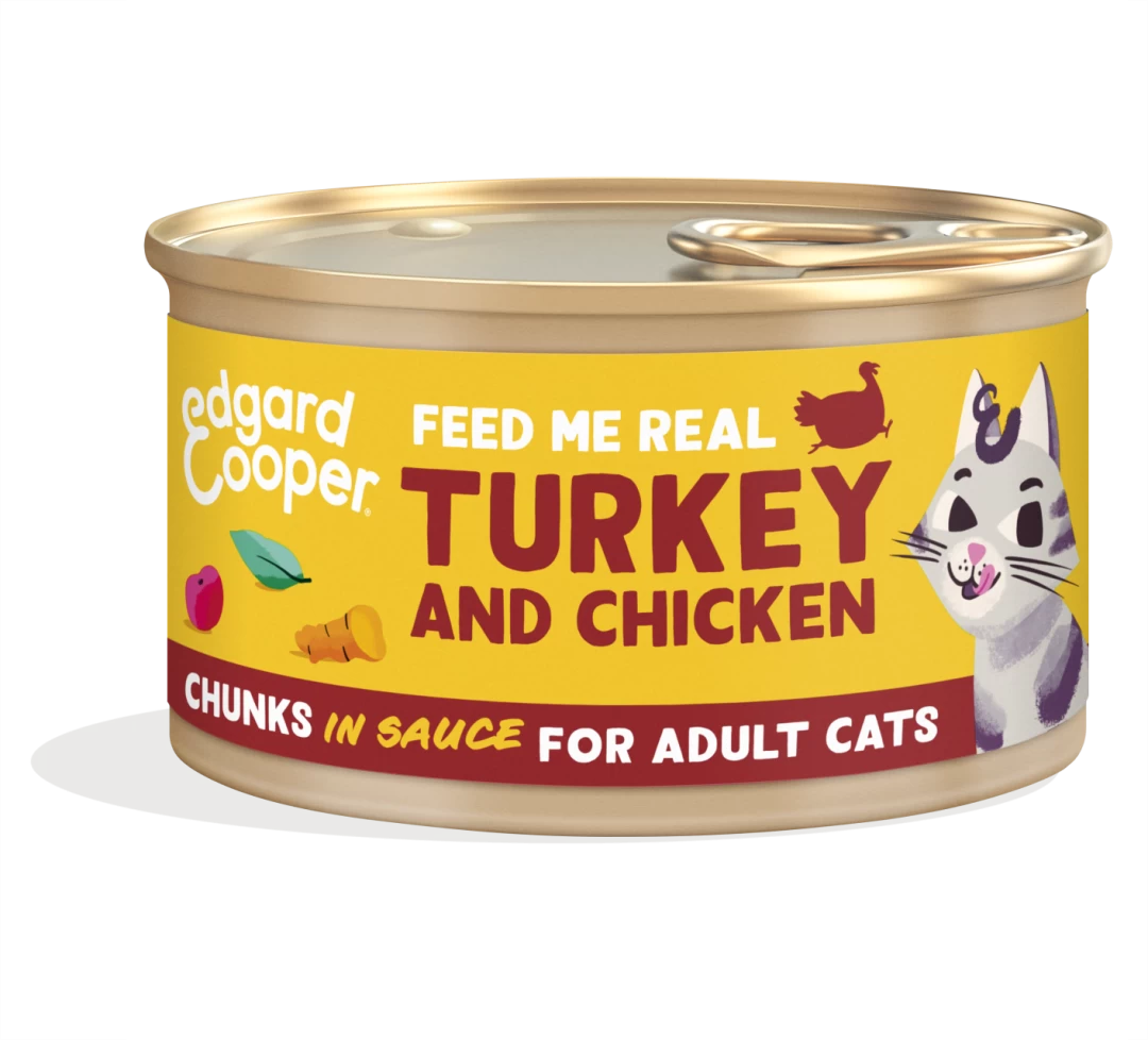 Edgard & Cooper kattenvoer Adult Kalkoen en Kip Chunks zijn sappige stukjes in saus en een feest voor de smaakpapillen van je kat. Dit volwaardige recept zonder junkfood is ideaal voor volwassen katten, ook als ze gesteriliseerd zijn.