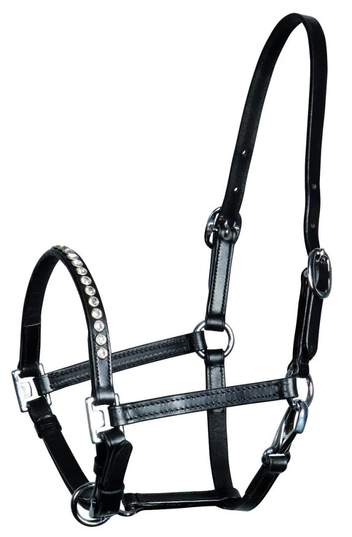 Mooi lederen halster met schitterende kristallen. Verstelbaar aan 2 kanten van het hoofd en op de kin. Verchroomde fournituren.