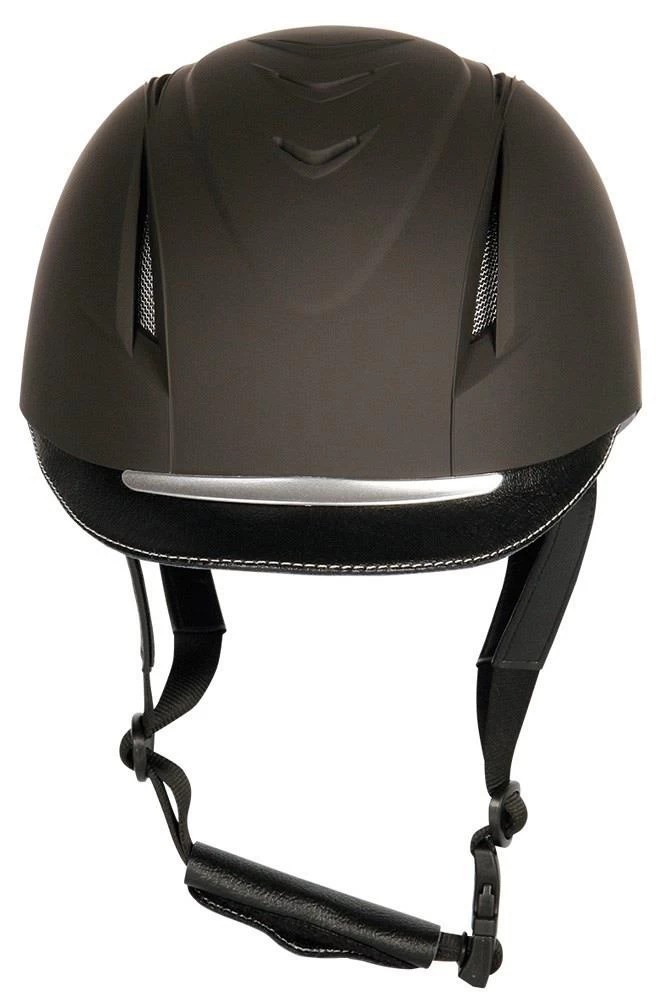 Eenvoudig op maat te stellen door middel van draaiknop. Tevens voorzien van meerdere ventilatiesleuven en met lederen decoratie op klep, rond de oren, onder de kin en achterop (piping).
