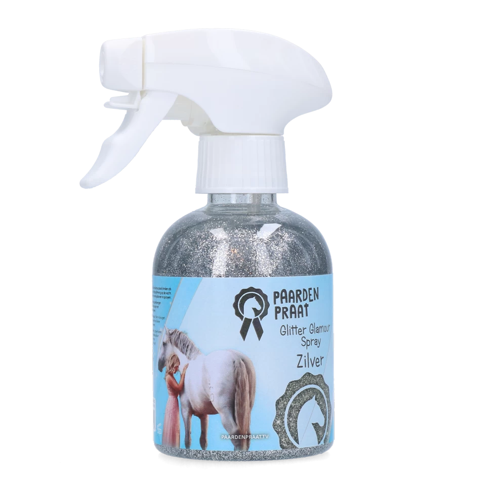 De Paardenpraat Glitter Glamour Spray Zilver laat je paard of pony stralen als nooit tevoren! Het zorgt voor een prachtige glittering op de vacht, manen en staart en is met een borstel makkelijk te verwijderen.