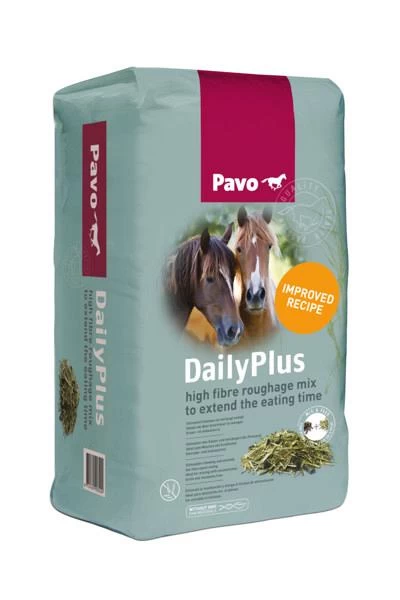 Pavo DailyPlus is een uitgebalanceerde ruwvoermix gemaakt van o.a. luzerne en timotheegras en ideaal om door je krachtvoer te mengen. De vezelrijke structuur zorgt ervoor dat je paard meer kauwt en tot wel drie keer zo lang over zijn krachtvoermaaltijd doet.