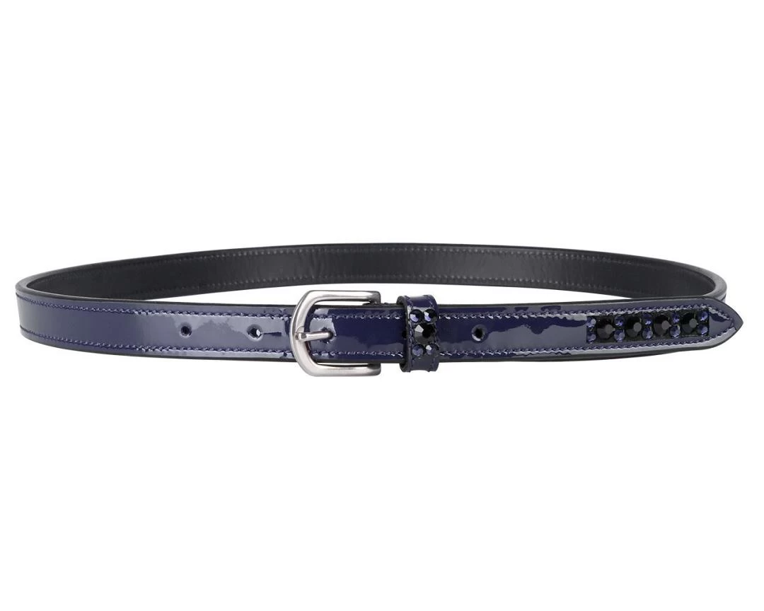 Maak je outfit compleet met deze navy lakleren QHP ceintuur Chianti. Zowel het uiteinde van de riem als de passant zijn gedecoreerd met Stellux steentjes in de kleuren zwart en navy die extra licht reflecteren en daardoor prachtig schitteren.
