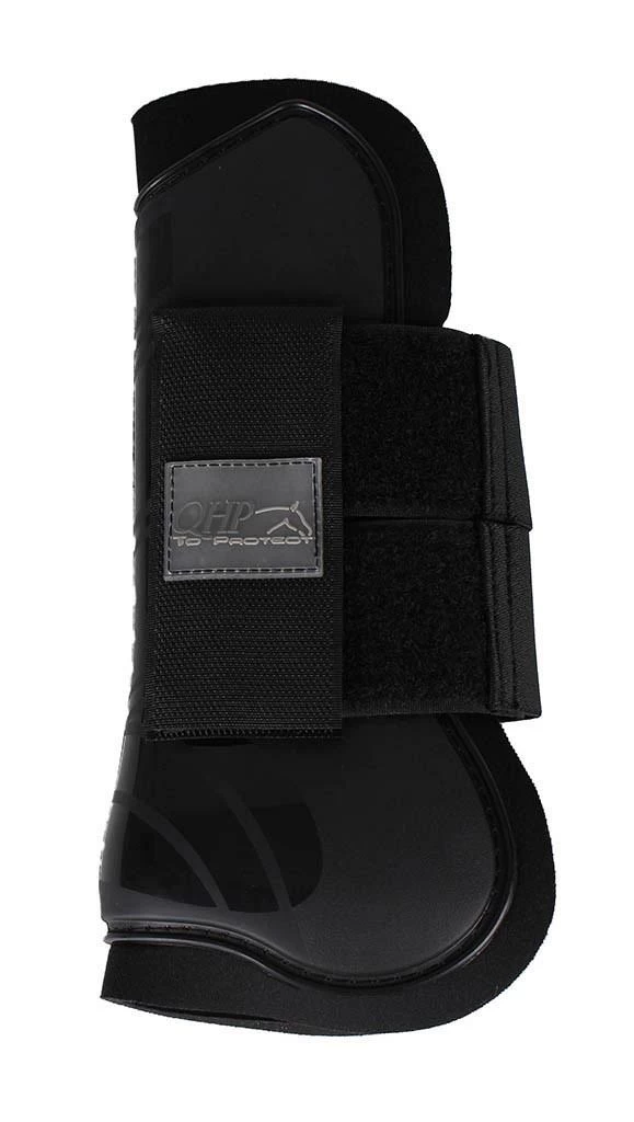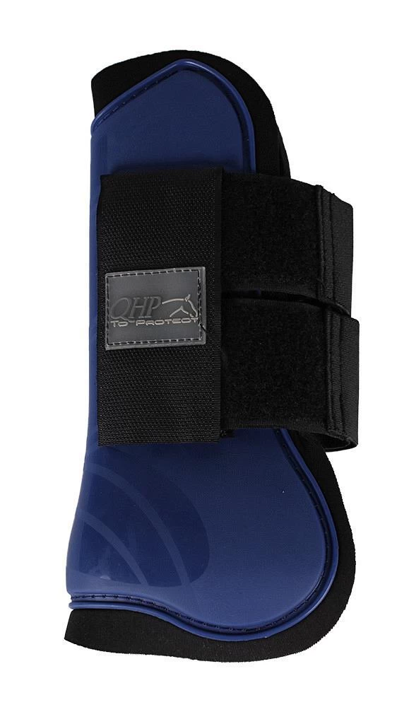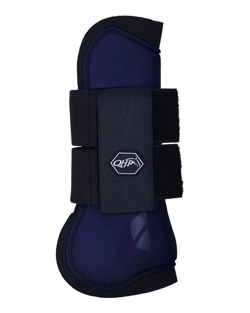 Set van 2 QHP peesbeschermers met harde plastic schaal en neopreen voering die zijn af te sluiten met klittenband. Te gebruiken om het paardenbeen te beschermen tegen aantikken.