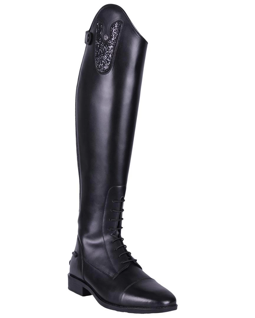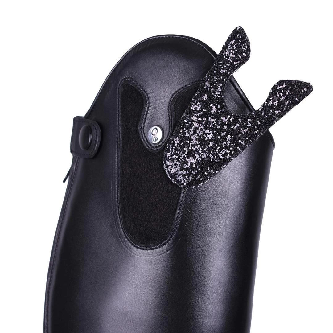 De laars wordt standaard geleverd met een glitterende top. De andere tops zijn apart verkrijgbaar. De laars is voorzien van een rits met elastische inzet aan de achterkant en elastische veters aan de voorkant.
