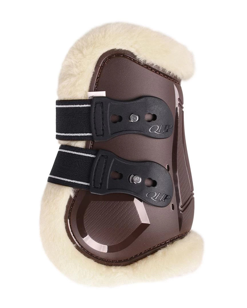 Bescherm de achterbenen van jouw paard tegen aantikken met deze QHP strijklappen Ontario voorzien van een imitatiebont voering. De voering voorkomt irritatie en is dus perfect voor paarden met een gevoelige huid. De beschermers zijn gemakkelijk te bevestigen met de elastische snelsluitingen.