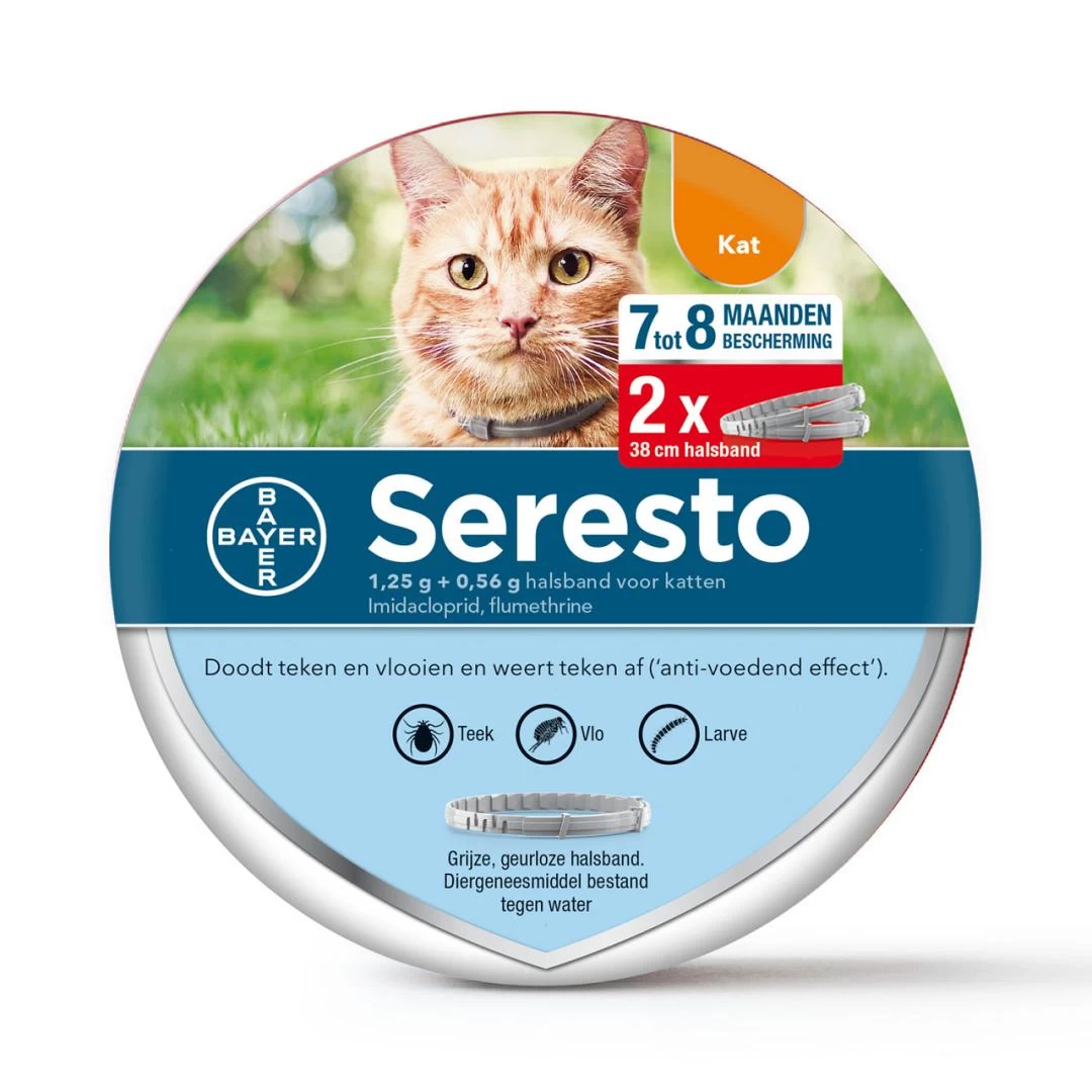 Seresto band voor katten is een innovatieve halsband tegen vlooien en jouw kat. Behandeling en preventie van vlooienbesmettingen gedurende 7 tot 8 maanden. De werkzaamheid tegen vlooien start onmiddellijk na het aanbrengen van de halsband. Seresto heeft een persisterende acaricide (dodelijke) doeltreffendheid tegen tekenbesmettingen (Ixodes ricinus, Rhipicephalus sanguineus) en afwerende (antivoedende) doeltreffendheid tegen tekenbesmettingen (Ixodes ricinus, Rhipicephalus) gedurende 8 maanden. De preventie van besmettingen met nieuwe teken start binnen de twee dagen na het aanbrengen van de halsband.