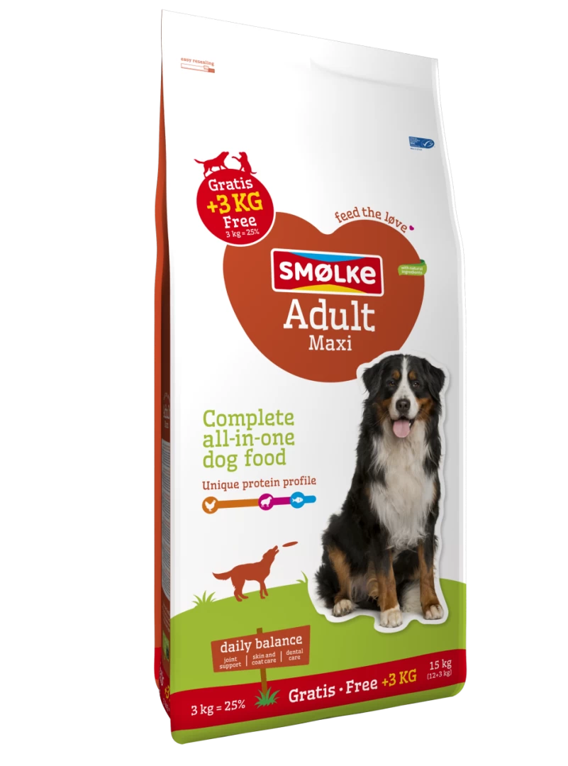 Smølke Adult Maxi is een complete hondenvoeding afgestemd op de behoefte van grote volwassen honden vanaf ongeveer 14-18 maanden en met een volwassen gewicht boven de 30 kg.