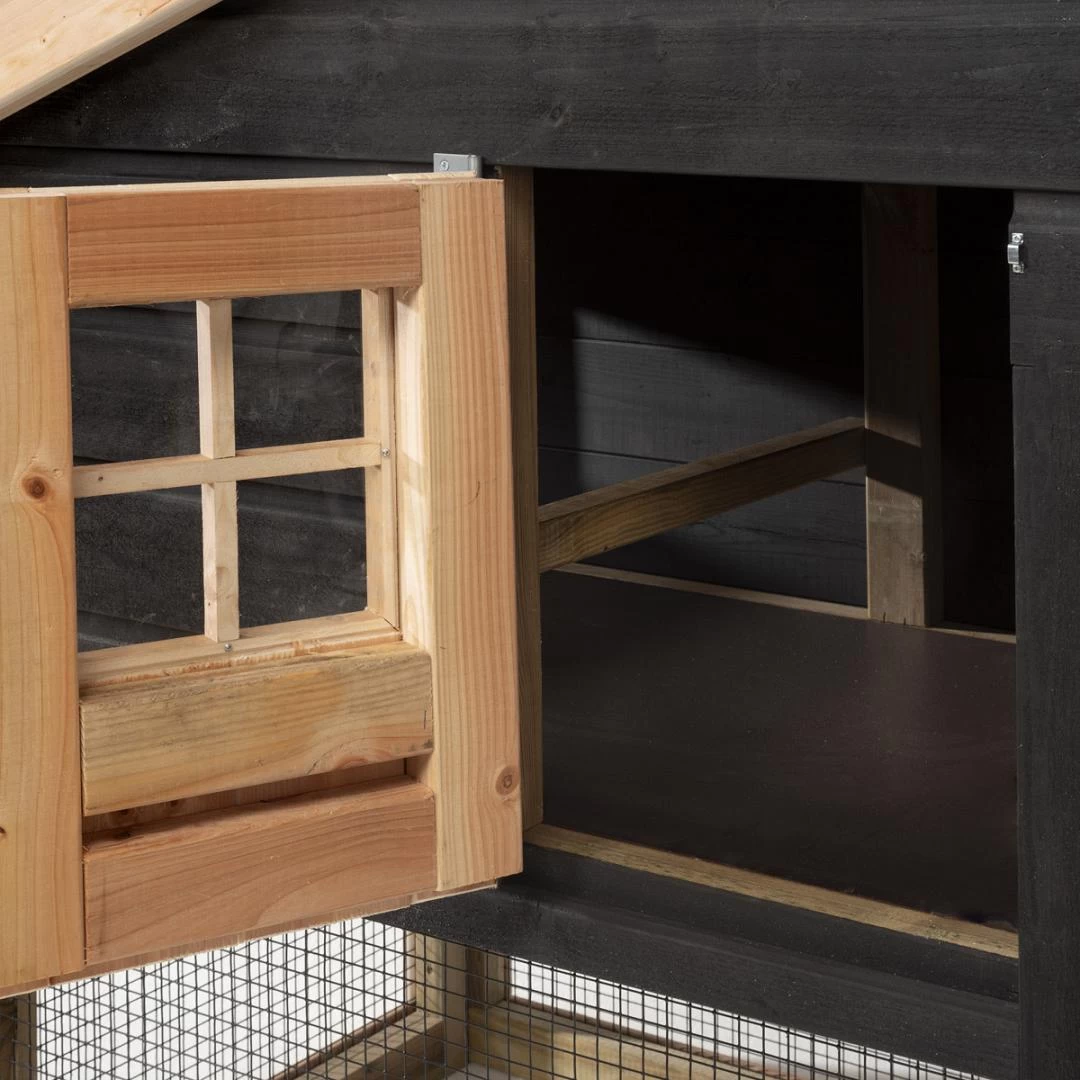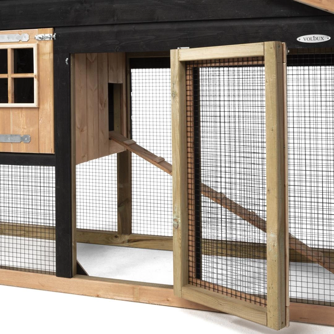 Het Voldux Kippen- of konijnenhok Remco bestaat uit een ruim opgezet nachthok én een ren om lekker te kunnen scharrelen of rondhoppen. De uitstraling van het verblijf is te danken aan de combinatie van verschillende hoogwaardige materialen. Zo is het hok opgebouwd met een frame van geïmpregneerd hout, is het hok afgewerkt met prachtige zwarte rabatdelen én is voor de afwerking gekozen voor Douglas hout. Om het totaalplaatje compleet te maken is het hok voorzien van hoogwaardig en stevig zwart gecoat 19×19 gaas.