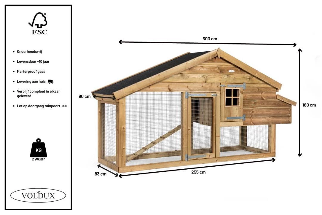 Dit verblijf wordt geproduceerd door gespecialiseerde vakmannen van Voldux die zorgen voor een perfect resultaat. Het verblijf wordt volledig gemaakt van geïmpregneerd hout. Dit maakt het hok onderhoudsvrij en zeer geschikt voor buiten.