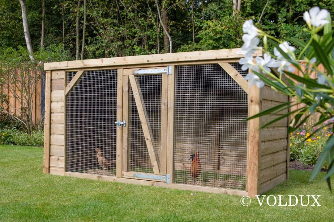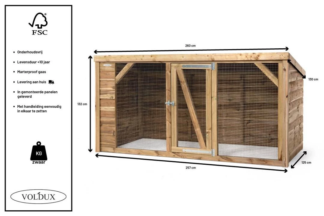 Voldux Kippen- of konijnenren Brit biedt een heerlijke scharrel- en speelruimte aan jouw kippen en konijnen, met een buitenafmeting van 260 x 130 x 132 cm. De ren is gemaakt van onderhoudsvrije materialen. Zo is de ren opgebouwd op geïmpregneerde houten balken, welke een stevig frame vormen. Voor de afwerking is gekozen voor geïmpregneerd rabat. Deze materialen vragen geen jaarlijkse schilder- of beitsbeurt en bieden toch een levensduur van 10 tot 15 jaar.